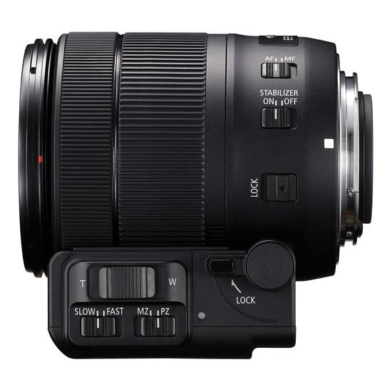 | Zoom Operation | Zoom lever sensitivity: +/- 0.1" / 3 mm Zoom lever direction: forward: tele / backward: wide Speed level switch: slow / fast Zoom motor: Micro USM |