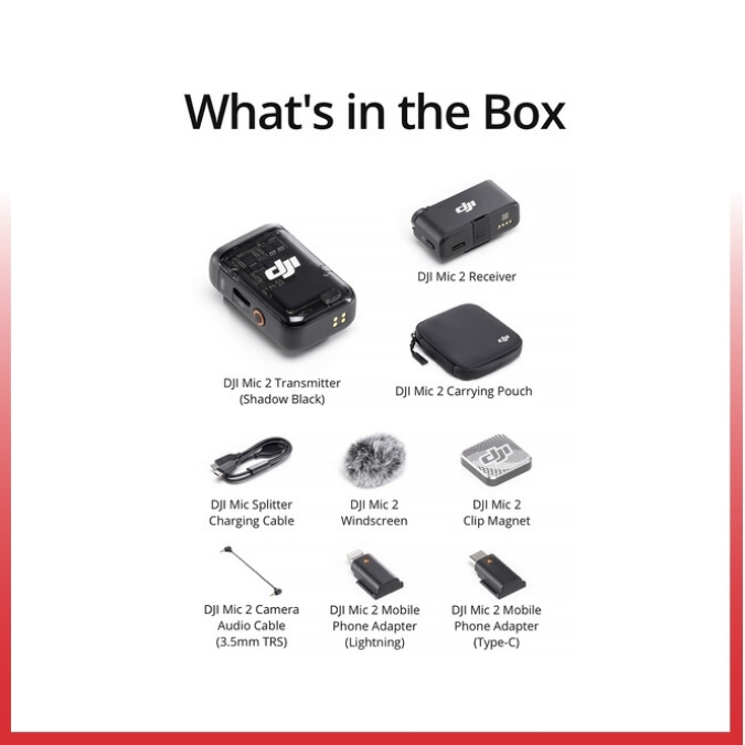 DJI Mic 2,adalah mikrofon/perekam digital yang mudah digunakan dan benar-benar nirkabel yang menawarkan kualitas audio yang hidup sambil menyediakan semua elemen yang diperlukan untuk menangkap audio dari subjek Anda ke kamera DSLR/kamera mirrorless atau ponsel pintar iOS/Android. Sistem ini merekam audio yang jelas dan dapat diandalkan hingga jarak 820 kaki melalui mikrofon/transmitter omnidirectional kecil yang dapat dijepit, yang berfungsi juga sebagai perekam cadangan untuk nirkabel tanpa khawatir. Penerima kecil dapat dipasang pada kamera DSLR atau langsung disambungkan ke port Lightning/USB ponsel pintar atau laptop. Cukup selesaikan setup awal dan Anda bisa siap merekam audio berkualitas dalam hitungan detik.