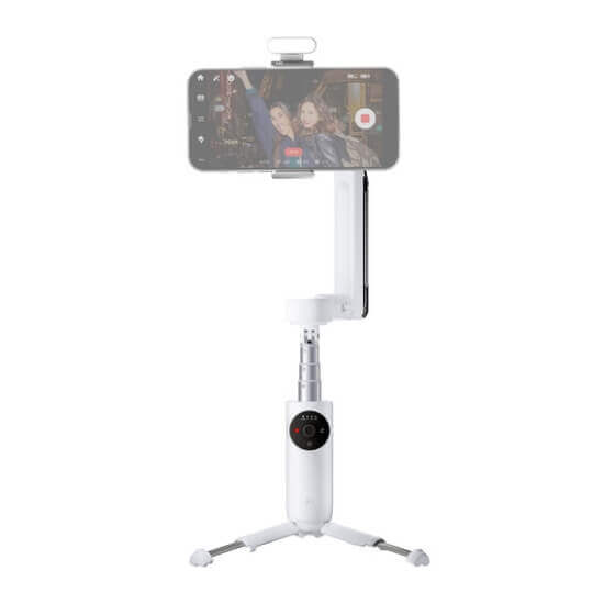 Insta360 Flow Creator Kit (White) Stabilizer Gimbal memiliki bentuk ringkas, serta tongkat selfie built-in dan tripod mini. Mudah diatur dalam satu langkah, sehingga Anda dapat memasang smartphone apa pun dengan lebar 2,5 hingga 3,3 inci pada dudukan ponselnya, dan dudukan ponsel magnetiknya memungkinkan pemasangan dan pelepasan yang mudah dan cepat. Alat ini dikendalikan dengan menggunakan SmartWheel terintegrasi yang dapat terhubung ke kamera Anda untuk memberikan kontrol zoom, pemicu, dan mode.
