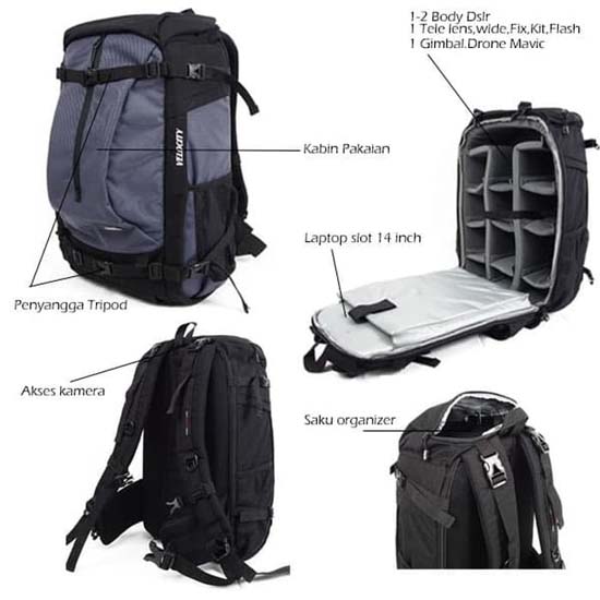 - Dapat memuat 1-2 Body Dslr, 1 Lensa, Flash & aksesoris
